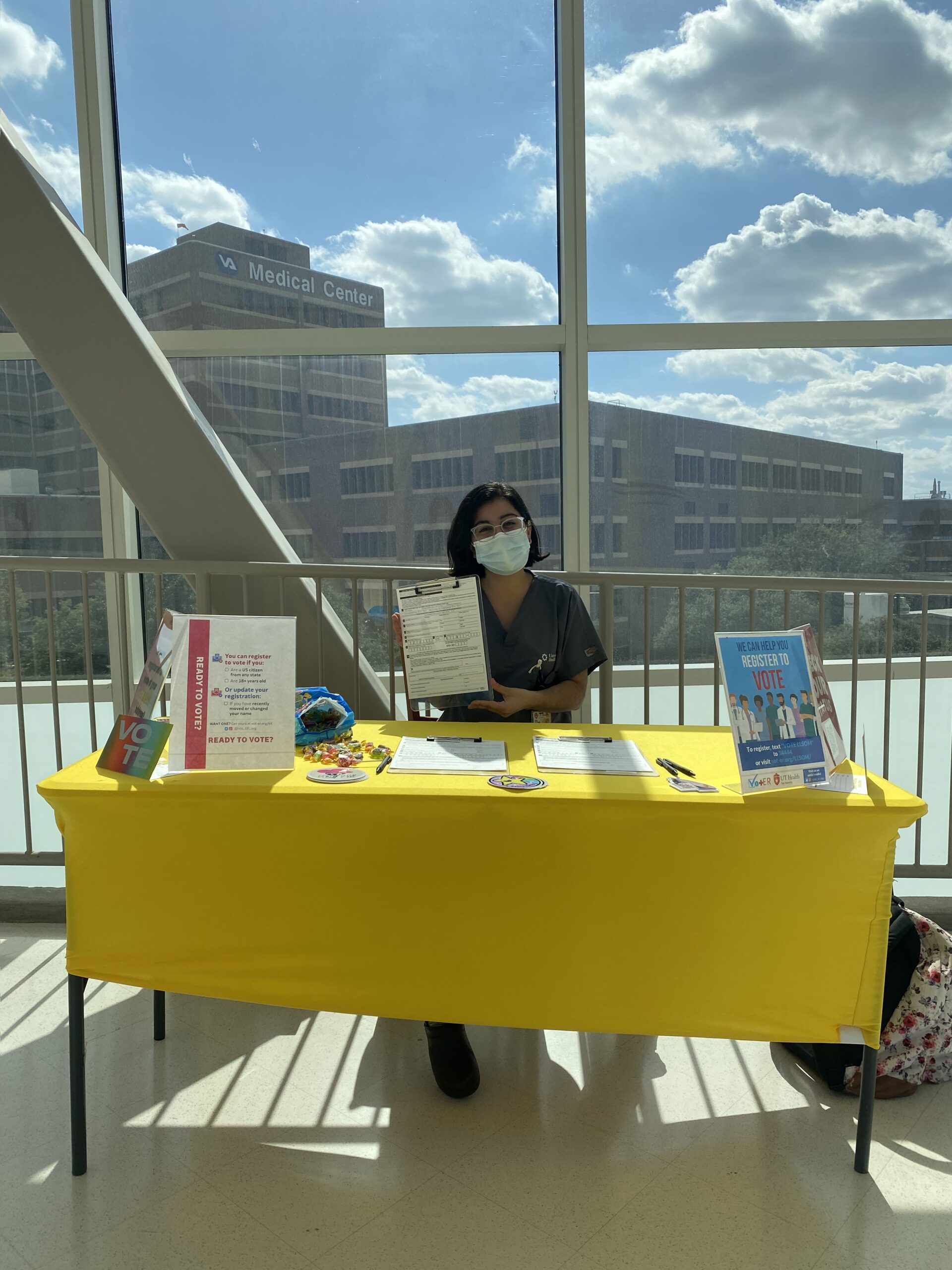 Once I got to college, I remember being very frustrated with everything that was happening in the news. I felt helpless. When I would hear about things that were going on around me in the world, I felt frustrated. As your standard pre-med bio major, how could I actually help with any of this? But then, the very first week that I came to medical school, they had the organization fair. I remember hearing about the AMA/TMA/BCMS group and learning that we could get involved in policy and advocacy work as medical students– which was really exciting for me! So, I went to all of those meetings. I was really excited about how all the students- people like me- were doing all these things. From there, I got involved in policy work through the AMA and TMA. Then, around the 2020 elections, one of my friends, Margot Favret, had reached out to me and asked if I wanted to be involved in on-campus voter registration. We partnered with MOVE Texas, which is an organization in Texas that works to improve voter turnout and voter registration, especially in young people. They do a lot of work on college campuses and were even at UTSA– that’s how I got registered there and how UTSA became a voting location. We were trying to establish on-campus voter registration during the height of the pandemic, pre vaccines, which made things very difficult. However, everyone was really supportive of this event, including UTHSCSA and UH admin. So, with many people’s help, we were able to do on campus voter registration. We also had stations at the main lobby in UH and the staff bridge to attract as many people as we could. Back then, we were able to register a few hundred people. We did again this year, too! Now we’re working to establish UTHSCSA as a voting location, so that the students and staff at UTHSCSA, as well as everyone over at the UH and VA and others in the med center, have easier access to voting.